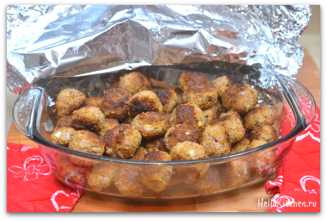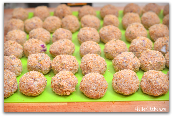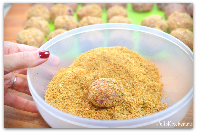 5. Обваливаем шарики в крошках. Я использую крошки со специями, так ещё вкуснее и ароматнее, но можно использовать любые крошки, которые есть под рукой. А можно сделать крошки самому, как в этом рецепте.