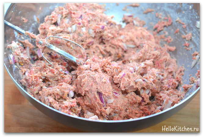 3. Добавялем в фарш лук, выдавливаем чеснок, добавляем все специи: соль, перец и мускатный орех. Затем добавляем крошки со сливками и хорошо перемешиваем миксером до однородной массы.