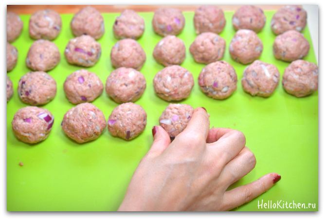 4. Из получившегося фарша формируем ровные шарики. Размер шарика на ваше усмотрение, но маленькие всегда выглядят аккуратнее и привлекательнее.