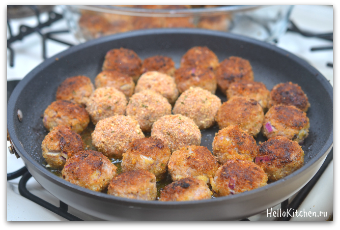 7. Далее нагреваем сковороду на большом огне, одновременно включаем духовку на 200 градусов. Обжариваем шарики с двух сторон до румяной корочки.