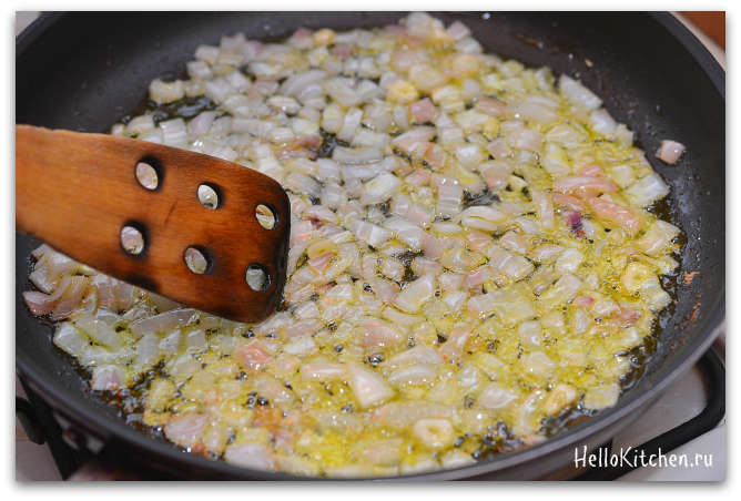 1. Нагреваем растительное масло в сковороде и на среднем огне обжариваем лук и чеснок до румяности.