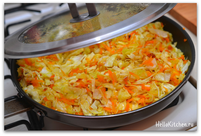 8. Выкладываем эту капусту в сковороду и хорошо перемешиваем, убавляем огонь до минимума, накрываем крышкой.