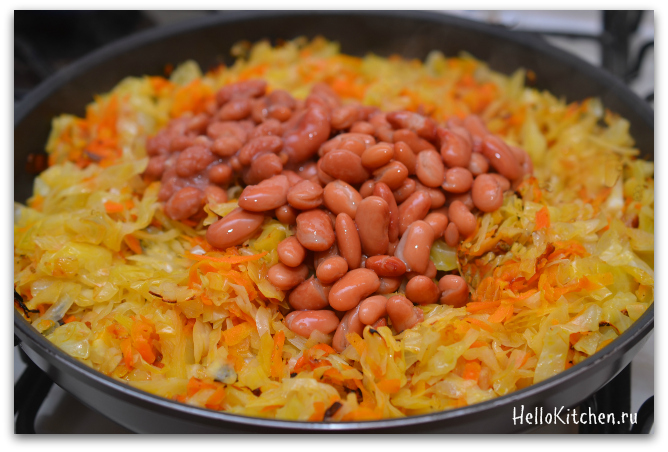 11. Когда капуста будет готова, добавляем фасоль и снова хорошо перемешиваем, выключаем огонь. Накрываем крышкой и даём постоять ещё 5 минут.