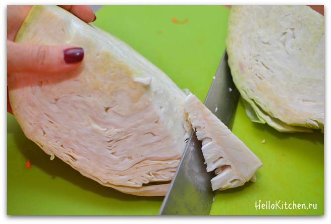 4. А пока морковка тушится, займёмся капустой. Самый простой и быстрый способ нашинковать капусту я увидела в книге Le Cordon Bleu. Берём половину кочана и разрезаем его пополам, затем острым ножом вырезаем кочерыжку.