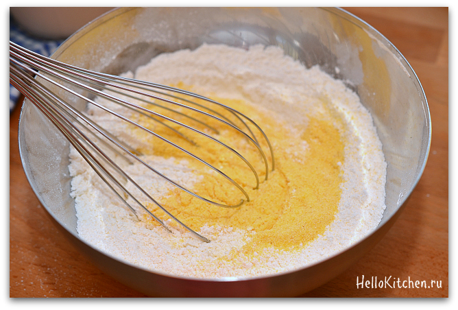 2. В миске смешиваем кукурузную и пшеничную муку, сахар, соль, разрыхлитель и соду. Я всегда смешиваю сухие ингредиенты венчиком, так всё смешается очень равномерно.