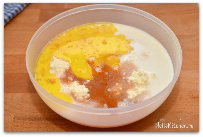 3. В отдельной миске смешиваем творог, яйца, молоко, растопленное масло, ваниль.