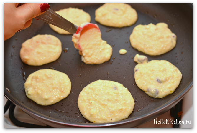 5. Разогреваем сковороду на среднем огне, смазываем её маслом. Выкладываем тесто столовой ложкой.