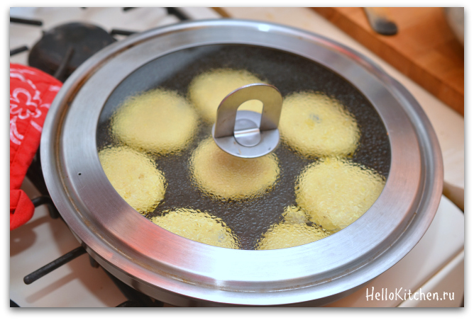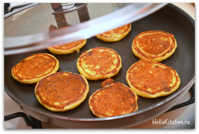 8. Переворачиваем лопаткой и снова накрываем крышкой, жарим, всё также на среднем огне, ещё около 2-3 минут.