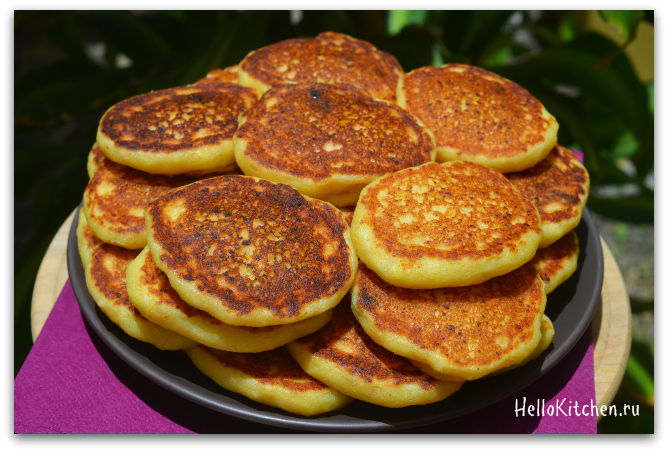9. Всё! Ладушки-оладушки получились очень пышные и жёлтенькие из-за кукурузной муки. А какие они вкусные с мёдом или вареньем ммм! Приятного завтрака!