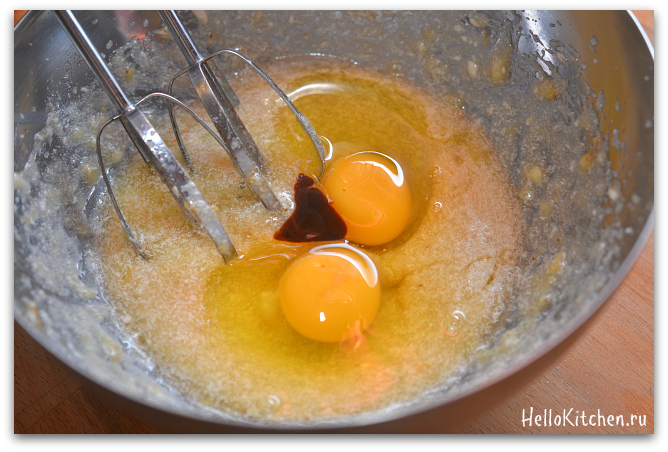 3. Добавляем яйца и ванильную эссенцию. Взбиваем до однородности.