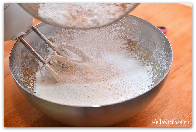 4. Просеиваем в бананово-яичную массу муку, соль, разрыхлитель и корицу.