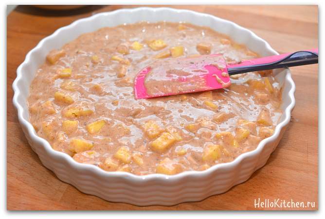 8. Смазываем форму сливочным или растительным маслом. Я чаще всего смазываю растительным. Выкладываем тесто в форму, распределяем равномерно и убираем в духовку на 25 минут или пока пирог не станет достаточно румяным.