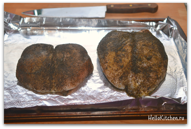 5. Разогреваем духовку до 220 градусов. Застилаем противень фольгой и выкладываем на него филе. Ставим в духовку на 30-50 минут (зависит от размера филе). Готовность можно проверить, проткнув самую толстую часть филе острым ножом, если вытекающая жидкость прозрачная — готово, если розовая, то ещё нет.