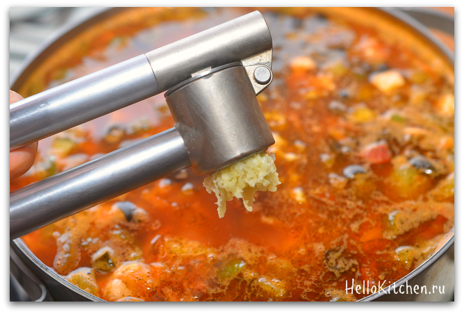 14. Выдавливаем чеснок, проверяем на соль, даём солянке закипеть и сразу выключаем.