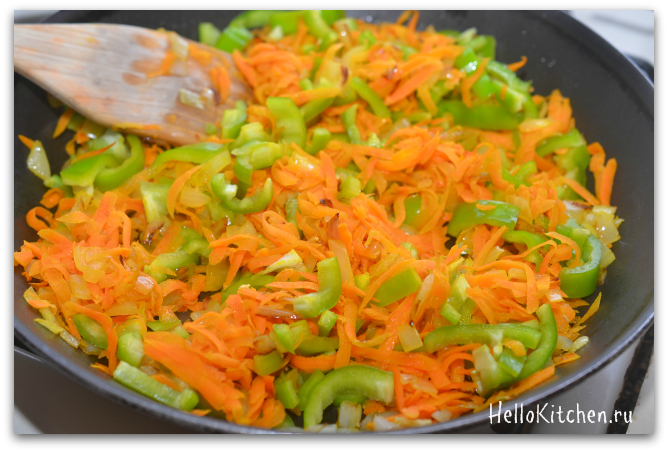 6. Как только морковь стала мягкой, добавляем сладкий перец. Продолжаем тушить на среднем огне, постоянно помешивая.