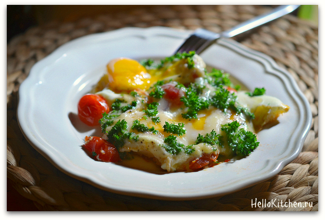 2-4 яйца, 5-10 помидорок черри, 30-50 гр сыр Моцарелла, зелень, соль, перец, 1 ч.л. [...]