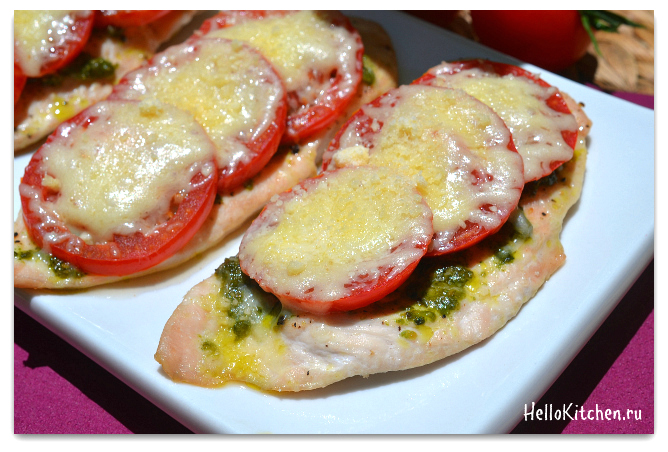 1 куриная грудка, 4 ч.л. соуса Песто, 1-2 небольших помидора, 4 ст.л. натёртый на мелкой т[...]